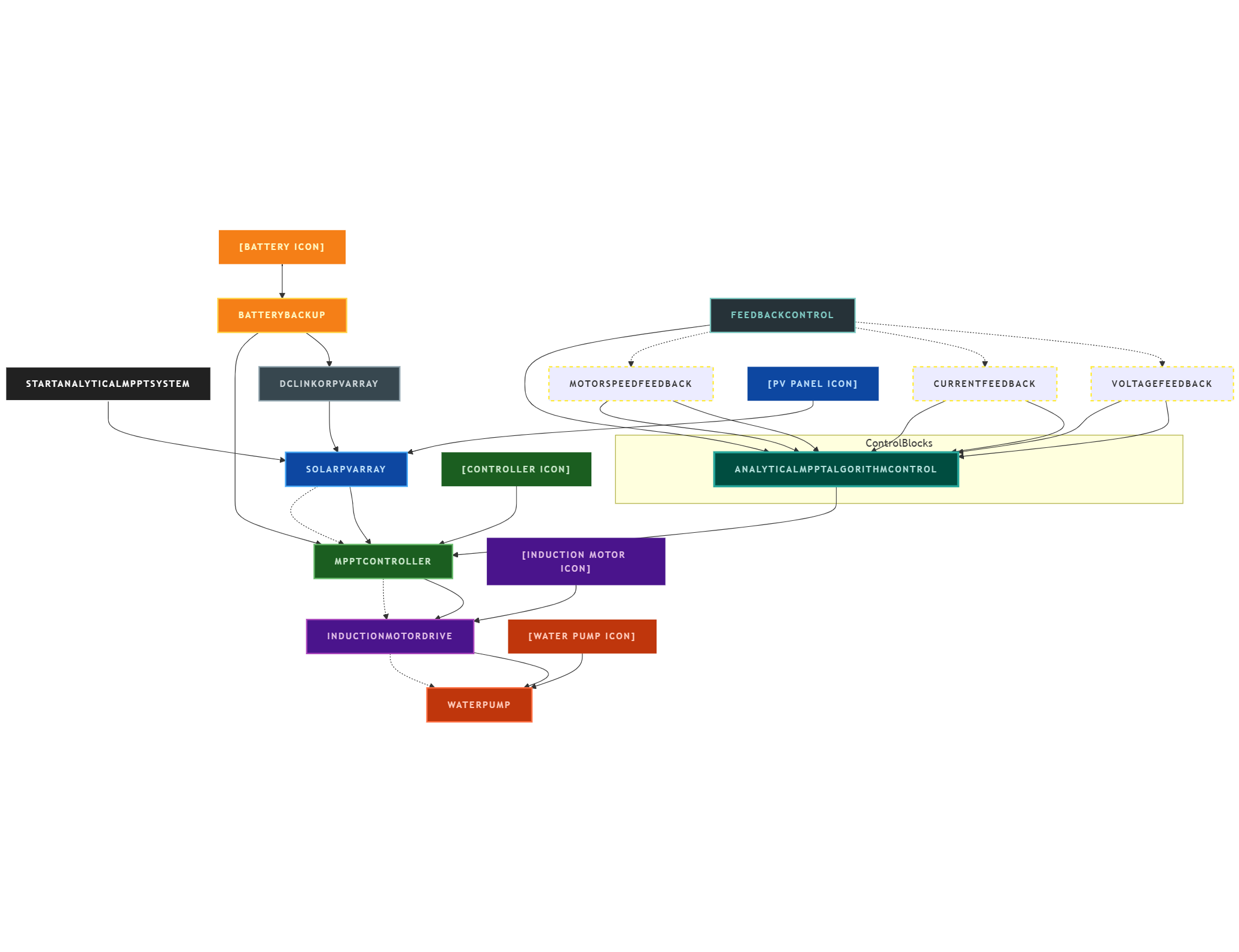 This project designs an induction motor drive powered by a solar photovoltaic (PV) system for water pumping applications, integrated with a battery backup for continuous operation. It employs a novel analytical Maximum Power Point Tracking (MPPT) algorithm to optimize power extraction from the PV array under varying irradiance conditions. The system uses V/f control for the induction motor to maintain speed and torque suited for water pumping, while the battery backup ensures reliability when solar power is insufficient.